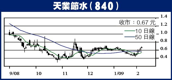 天業節水(840)對上星期臨尾兩個交易日,成交先行,先嚟轉短打。祖國北方旱災,A股市場呢期就狂炒「節水抗旱」板塊。港股當中,天業主打農業節水灌溉系統及相關配件製銷及安裝,有point炒。天業主打業務,一則食正阿爺環保國策,更加受惠谷內需扶農國策,中線業務前景,值得高度關注。呢轉趁交投異動,博天業升20%到0.8元,NAV折讓仲係講緊40%樓上,未有耐追到祖國類近股水位。