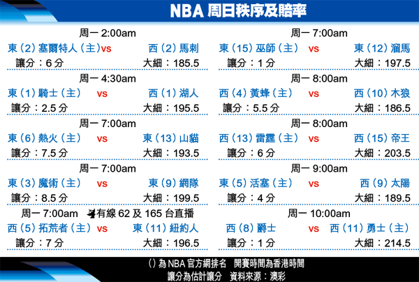 此外,NBA周日將上演兩場矚目大戰,綠軍連續7場作客贏波後,周日將主場迎戰西岸「2哥」馬刺;而戰績冠絕聯盟的湖人,同日則作客東岸「1哥」騎士。騎士賽前傳來壞消息,NBA翻看他們上周三對紐約人的比賽後,「褫奪」該隊前鋒勒邦占士的「3雙」;聯盟認為占士該仗10個籃板中,有一個應為賓華萊士搶得。