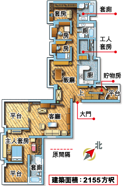 建築面積:2155方呎;另平台317方呎及天台1545方呎
