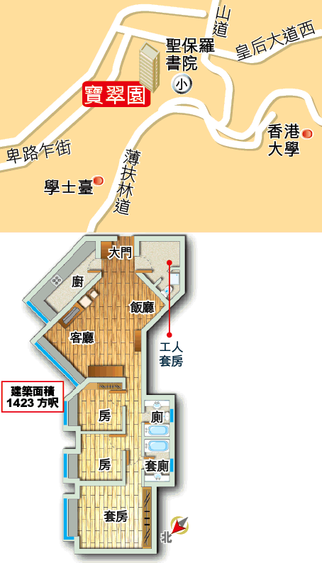 寶翠園約1400方呎3房連套房單位,供應量最多,現時入場費低於1000萬元,每方呎最平6600餘元有交易,不過屬極低層山景單位。
