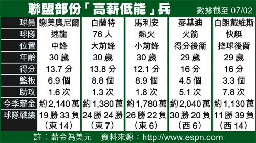 球員「高薪低能」,往往也得益於球隊總經理的「幫助」。76人大前鋒白蘭特(圖)今季從快艇來投,獲得一紙5年8,000萬美元的肥約,76人總經理好像已忘記他上季因跟腱傷只打了8場;結果白蘭特今季只上陣29場,日前又因右肩傷提早收「咧」。埋單計數,白蘭特今季收「咧」前平均貢獻13.8分,而打29場賽事便賺取1,380萬美元年薪(薪酬為遞進制),平均一場比賽賺逾47.6萬美元(逾370萬港元),羨慕死人。
