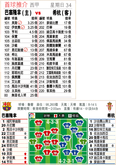 美斯連續兩仗任後備,教練哥迪奧拿解釋要讓這名阿根廷球王休息,以免操勞過度影響狀態。上周聯賽作客桑坦德,落後0:1下換入美斯,結果連建兩功反勝2:1;到日前西盃4強首回合(2:0勝馬略卡),美斯同樣僅在55分鐘入替,連續兩場後備上場未致消耗太多體力。周日聯賽迎擊希杭,相信美斯、沙維及伊度奧等主力會全返回正選行列。