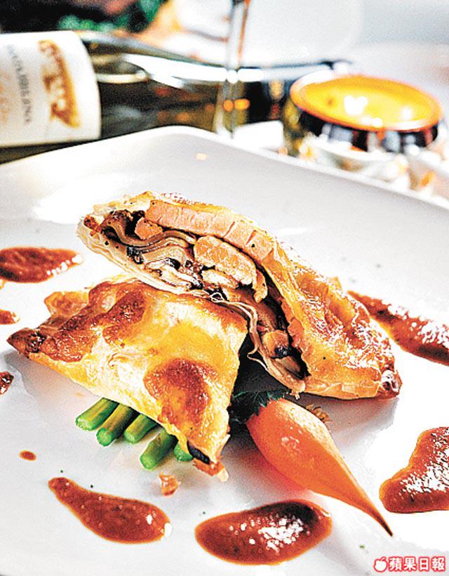 將挪威三文魚柳煎到半熟,與炒香的野菌一同用法國紙皮包好再焗,紙皮有如牛油紙般薄身焗起來十分香脆,配上濃烈的龍蝦番茄汁,令香口的三文魚更惹味。