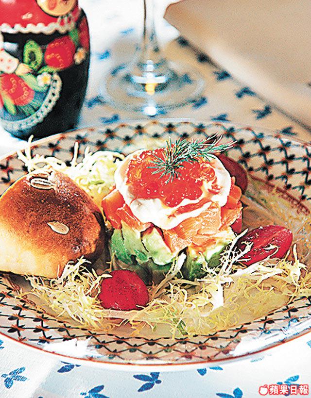 以切粒牛油梨做底層,蓋上熏過檸檬汁的煙三文魚,再伴上三文魚子。