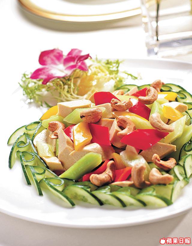 1.紅黃燈籠椒切角後炒熟備用。芥蘭去葉留莖,刨皮切粒後汆水,下糖、鹽及雞粉煨3分鐘,撈起浸冰水。素雞切粒後下油鑊略炒,加入燈籠椒及芥蘭,下鹽及雞粉兜勻上碟。