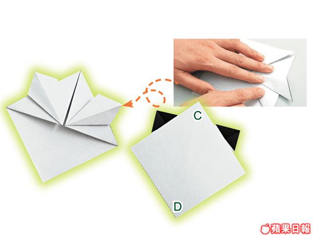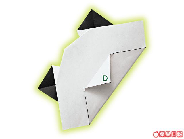 4把C角向後摺形成頭頂,D角則往上摺成大三角,再把頂尖摺向下。