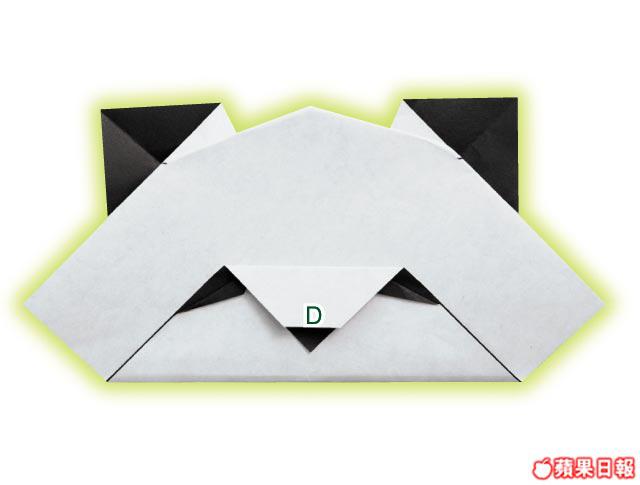 5把D角尖端向內摺形成鼻子。再把左右的位置向外翻開成小三角,摺出眼睛。