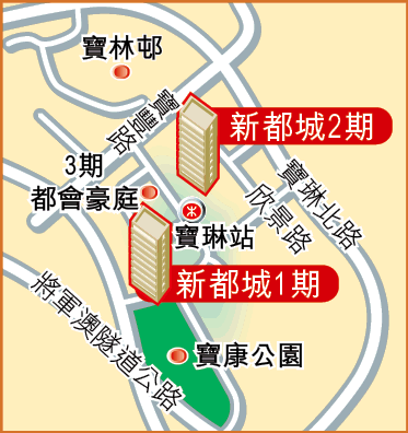 新都城分3期發展,提供逾6700個單位,當中以第2期佔地最廣,基座商場及平台會所面積最大,2期銀碼較細的兩房戶,成為上車客熱門之選,現時入場費170萬元。美聯黃少明表示,新都城1期樓齡最舊,近期經濟不景氣下,3房筍盤湧現,當中不乏4座G、H及5座E至H室靚景單位,望寶康公園遠景,售價340萬元起。