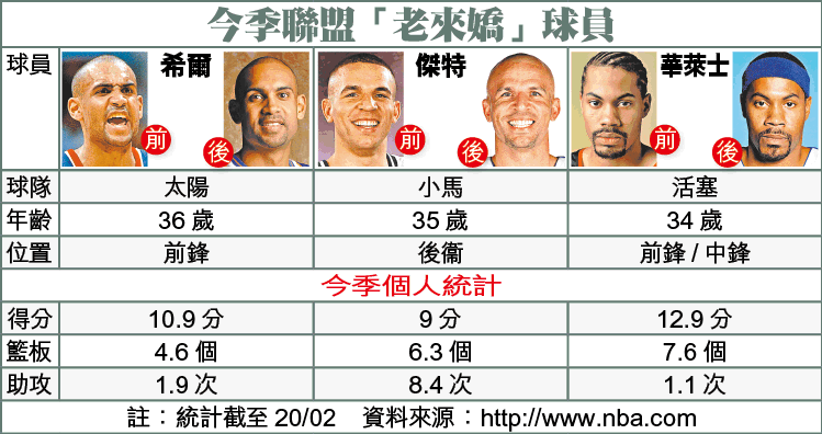 聯盟有人未老先衰,自然有人駐顏有術;而且身手未退化,仍有力在所屬球隊任正選。太陽前鋒希爾就是代表人物,雖年屆36歲,但一對圓圓大眼,仍像一個20出頭的小伙子。
