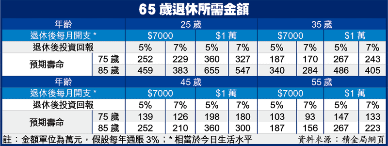 以25歲的僱員為例,現時月薪1萬元,預計退休後每月支出,相當於今日生活水平7000元,按3%通脹率計算,40年後每月需23206元。以港人人均壽命85歲,並於退休後的回報為5%計算,於65歲退休時,要準備459萬元才夠20年退休生活,安享晚年。