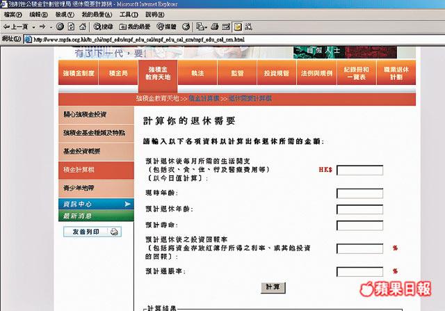 市民如想知道自己所需退休金額,除可聯絡理財顧問,亦可利用積金局網頁( http://www.mpfa.org.hk/)的「積金計算機」,填入資料如退休後每月開支、現時年齡及預計退休年齡等,就可知道所需金額,從而部署投資大計,揀選合適的基金。