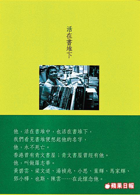 【本報訊】青文書屋負責人羅志華去年2月被發現死在書堆下,一年後的昨日,一群生前友好齊集,以分享會形式悼念這位書癡。友好並把過去一年的給羅志華的悼文結集成書─《活在書堆下─我們懷念羅志華》,寄望讀書至上的「羅志華精神」得以延續於書香淡薄的香港。 記者:蔡元貴