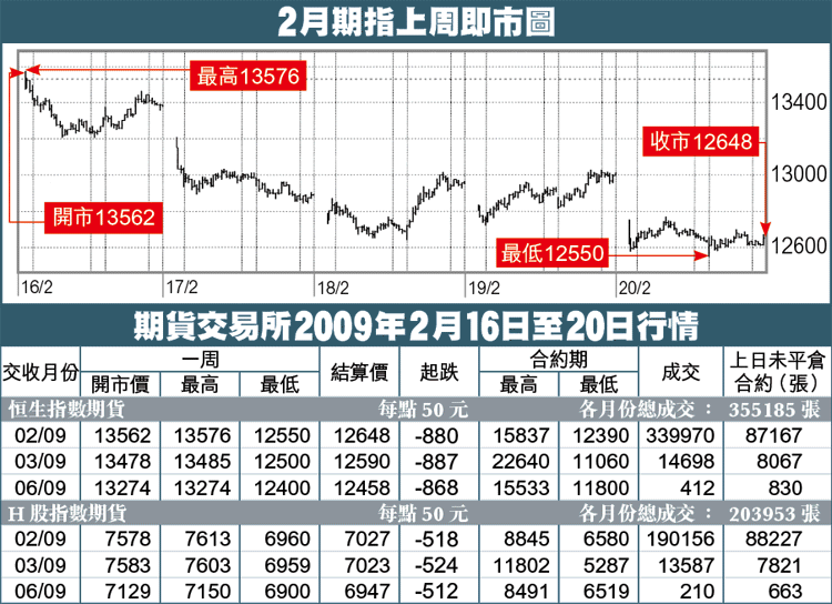 期指反彈受制13600,裂口位前再度轉弱,短期形態相當不利。周線圖急挫,貼於低位收市,技術指標下跌,處中軸之下,雖然近5個星期形成橫行區,但上周似有向下破位之勢,若再出現大裂口下跌,止蝕盤會再推低,最終要下試12000或去年11月低位。