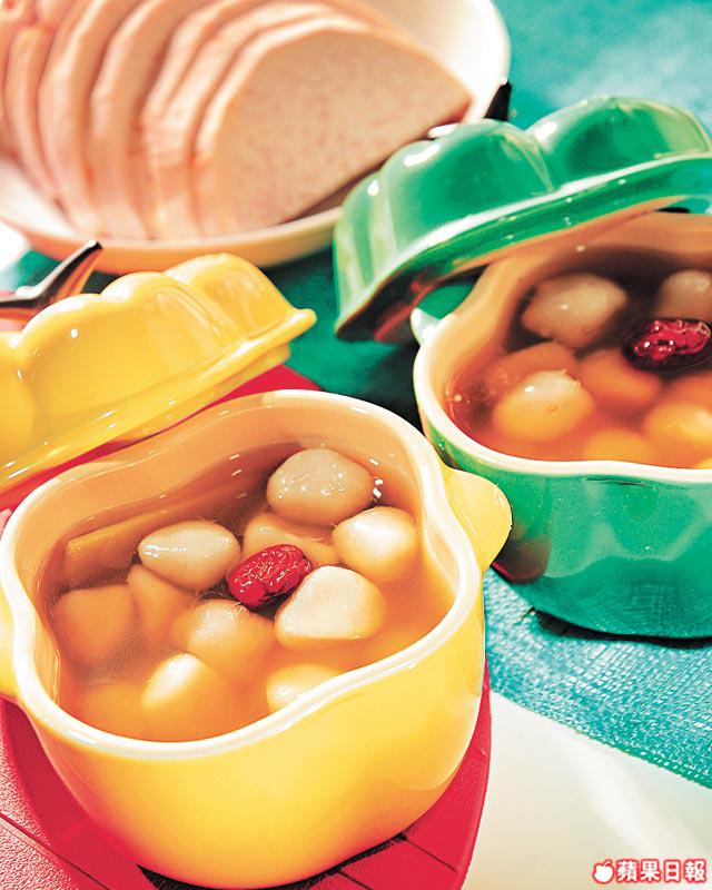 芋頭片350克、地瓜粉(幼)180克、糖粉3湯匙、龍眼亁2湯匙、去核紅棗8粒、水適量