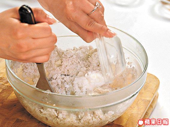 2.麵粉、泡打粉和蛋撈成麵糊備用。