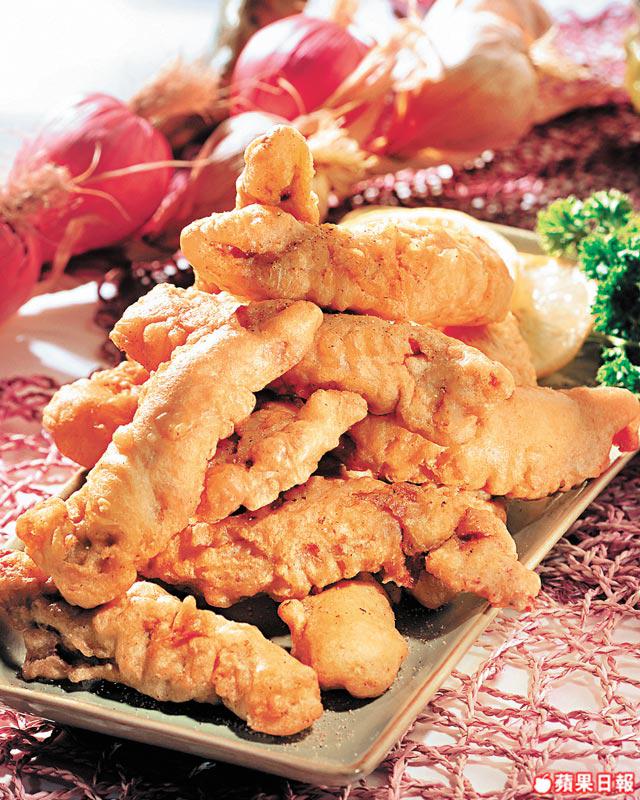 3.豬肉條先蘸上麵粉再蘸麵糊,然後放入滾油中用中火炸至酥脆,撈起後再放入油鑊中,用大火炸至金黃,即可上碟,最後撒上味椒鹽即成。