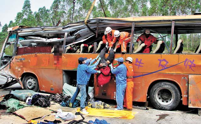 廣西南寧至北海高速公路昨日清晨約7時發生嚴重交通意外,一輛載有約50人,從貴州都勻平塘開往廣東東莞的快速巴士,疑因閃避前面大貨車灑落的麥麩失控翻側,巴士嚴重損毀(左圖),救護人員全力搶救傷者(右圖),事故最少造成12人死亡,39人送院救治,案中的大貨車已被公安截獲。 新華社