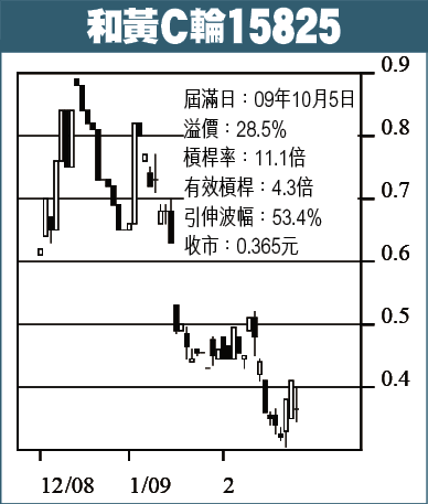 和黃C輪15825:和黃(013)上周五收40.85元,跌2巴仙,算係跌得少。上周和黃股價逆市造好,幾條短期平均線都升緊上嚟,如果守得住38.50元,反覆升穿42元機會唔細,破位睇46元,可以諗吓隻C輪15825,現價36.5仙,有效槓桿4.3倍,正股升上46元,15825睇59.5仙,正股跌穿38.50元,就沽咗隻輪止蝕。