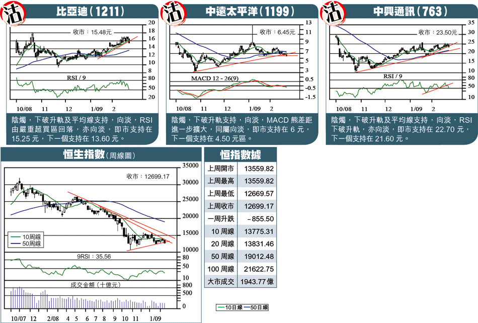 恒指周線圖所見,在待變的陀螺後,呈大陰燭,並下破升軌支持,走勢向淡,如果今周未能重回升軌之上,技術上將確認下破,大市將進一步尋底。最好的發展是重回升軌之上,並借勢上破降軌、10周線(13775)及20周線(13831)重叠區,展開新的升勢(或者說較大幅的反彈);次好的走勢是重回前升軌之上,但無法進一步造好,形成膠着的形態。以現時的市況來看,似乎這一發展,更符合事實。換句話說,港股現時並不具備大幅反彈的動力,亦沒有大幅下挫的誘因,繼續其不上不下的無趨勢市。
