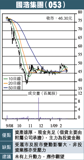 國浩的焦點應集中於其投資成果及資源,其他東南亞物業、英國酒店等業務已是其次,現價46.30元,PE及息率難預估,相信末期仍派息,可參考的每股資產淨值107.96元,股價折讓57%。國際金融市場未穩定,但下跌風險已較前為低,亦看不到明顯升勢,仍宜觀望。