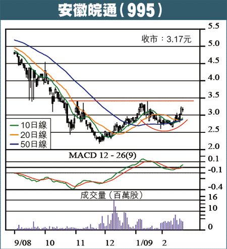 安徽皖通高速(995)走勢成個收集形態,由去年11月開始,形成大小兩個圓底,近日由低位回升,在3.20元水平形成旗形,亦已拋離3條短期平均線,3.40元係圓底頂部阻力,一衝破初步可見4元,一年目標價為4.50元。
