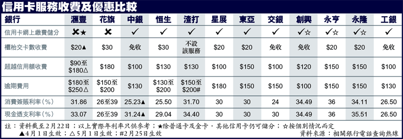 除了削減積分優惠,滙豐5月1日開始調高逾期交卡數手續費及超越信用額收費,加幅近四成。滙豐發言人回應,此舉是跟隨同業。目前透過信用卡網上繳費又不設積分優惠的銀行,還包括花旗。