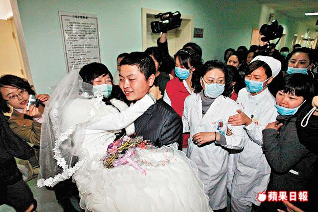 一對來自內蒙古的年輕情侶,1月17日在山東省青島一醫院的病房,舉行了一個簡單而感人的婚禮,21歲的新娘高俊峰是瀕臨死亡邊緣的白血病患者,26歲的新郎宋冰不離不棄,雖慶幸在中華骨髓庫尋獲匹配的骨髓,惟對50萬元人民幣的醫療費一籌莫展!宋冰哽咽地說:「上天好眷顧俊峰,成功找到匹配骨髓,救她就只有這個機會,如果沒錢,逼不得已也要放棄治療。」