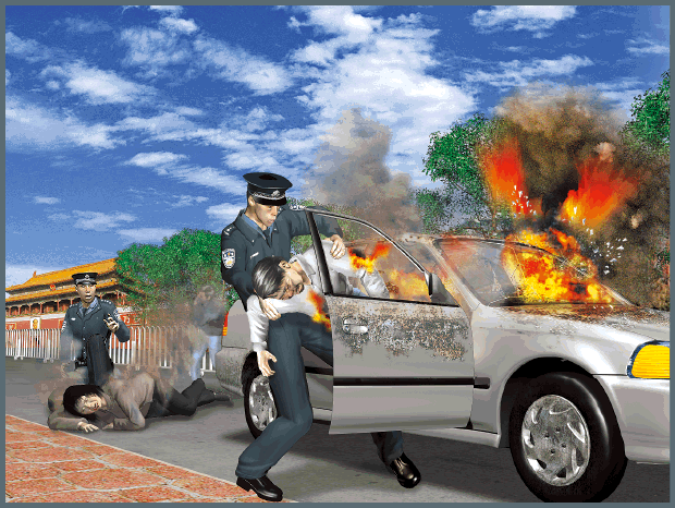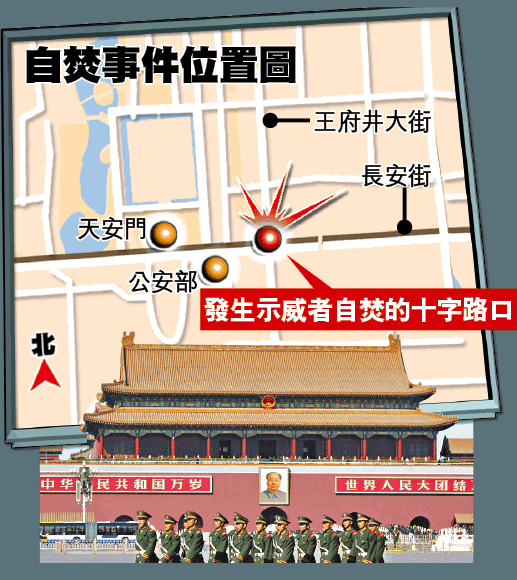 【本報訊】全國人大、政協「兩會」在北京舉行前夕,天安門附近的長安街王府井路口昨日發生自焚事件。一輛掛新疆車牌的私家車被公安截停時,車上三人縱火自焚。事件中一對夫婦受傷,另一人被公安帶走,但官方聲稱他們是由外地到北京反映個人訴求問題。中國組