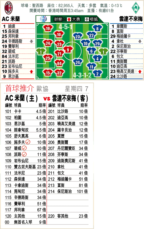 周四歐協盃上演32強次回合賽事,意甲球隊AC米蘭首回合有一個作客入球在手,主場面對德甲的雲達不來梅,料以穩打穩紮踢法等待對手犯錯,取1.55倍主W外,並補3.45倍「讓球主客和」的「和局」。(球賽編號:星期四7;有線61台明日3:45am直播)牽牛