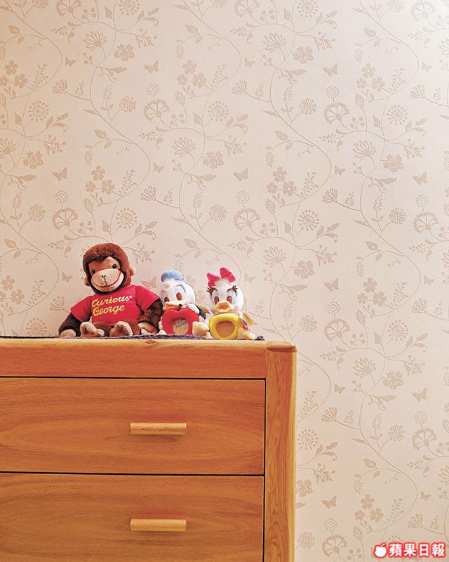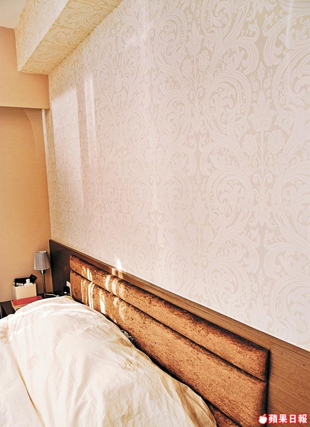位於半山1,300平方呎的慧明苑,屋主花110萬於裝修上,而全屋用上Goodrich牆紙。室內設計師馬生說:「屋主本身喜歡淺色及清新感,故全屋均以米白、淺啡為主。」先說主人房,整個房間均選淺木色家具,設計師則以淺米白色的復古圖案為主牆的牆紙,自然而溫暖。「屋主要求女少主人房以粉紅色為主題,但又恐怕太多粉色,故我刻意將一堵牆選用米白色花圖案牆紙,更切合小朋友的純樸性格。」客廳則於沙發位置貼上牆紙,本以為客廳只用淺色牆紙,但走近牆身看,便發覺牆紙是仿馬毛Pattern,令視覺及手感上更特別。