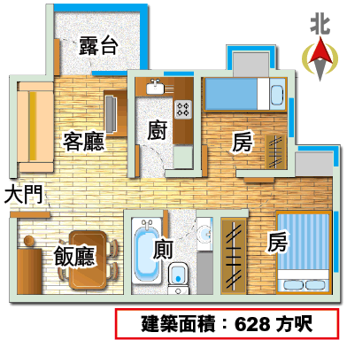 建築面積:628方呎