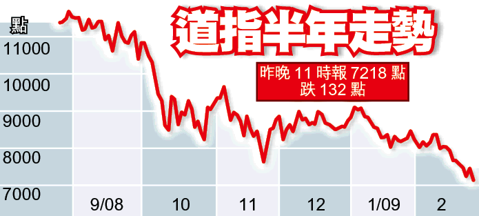開市後半小時(本港時間昨晚11時),道指跌132點,報7218點;納斯達克綜合指數跌26點,報1415點。