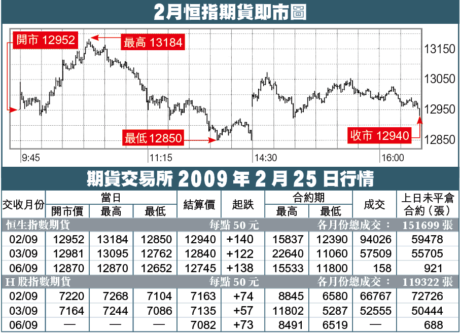 期指稍為回穩,早市一度反彈至13184,接近預期阻力前有調整,其後橫行拉鋸,以12940收市,升140點,轉低水65點;3月期指以12840收市,升122點,低水165點。