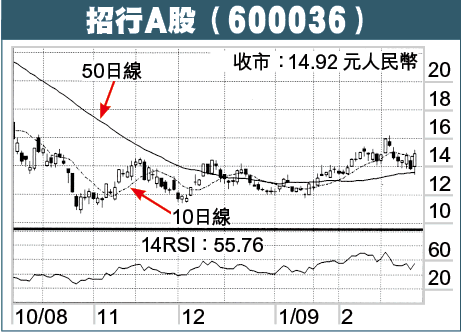 昨日招行A股升勢極之強勁,一度漲至停板,最高升至15.18元人民幣,成交量亦急增至近期高水平,達46億餘人民幣,是昨日上海交易所成交金額最高之股份。