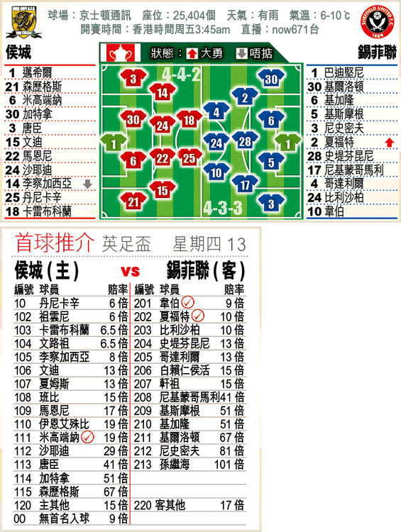 侯城周四於英足盃第5圈重賽,雖然擁有主場之利,但以該隊踏入下半季之頹勢,確難有把握擊敗英冠球隊錫菲聯,開出「讓球主客和」侯城[-1],「客勝」要捧。(球賽編號;星期四13;now671台明日3:45am直播)