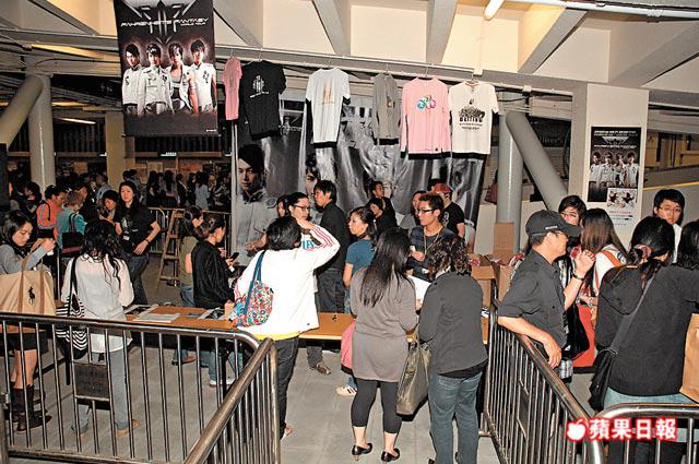 紅館外有飛輪海的精品出售,當中有cap帽、T恤、貼紙和螢光棒等,還有演唱會紀念版套裝,內有T恤、cap帽、掛畫和CD等精品,整套售900元,不少fans排隊購買,反應不錯。