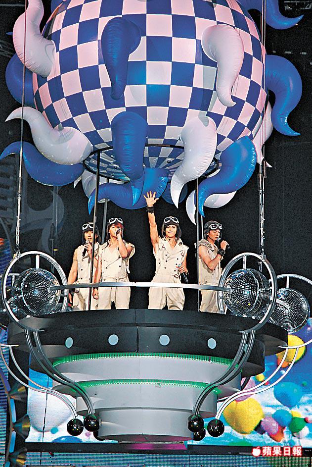 飛輪海四子坐着巨型熱氣球空降紅館,甚有氣勢,fans見狀即興奮大聲尖叫。四子又唱又跳之餘,還大玩長棍,其中有腳傷的汪東城冒着傷勢加深的危險,忍痛瞓身演出,他更跪地滑落斜路,認真搏命。