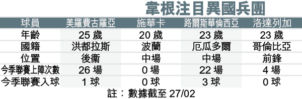 當然,韋根亦會繼續尋找其他具潛質的異國兵,除上月動用450萬鎊收購洛達列加外,布魯士亦正計劃羅致南韓國腳趙元希,以及厄瓜多爾前鋒基斯迪賓尼迪斯,務求擴大隊中的異國兵團力量。