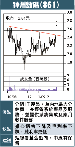 估計至3月止年度,業績與上年相似,神數現價2.81元,預期PE6倍(不包括特殊項目),息率5.5厘。今年業績或受考驗,純利率低至1.5%以下,投資價值不高。