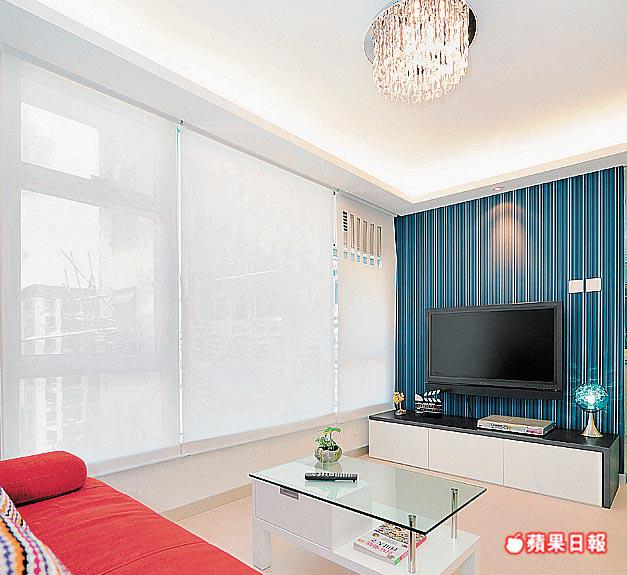 設計師Ernest認為,天花、地板、牆身大部份用白色無問題,但重點的大廳不宜太冷,純白色又會太寡,特別揀選電視背後鋪上藍色直條牆紙,總算有視覺焦點。反正白色是百搭,配甚麼顏色也好看,襯上一張紅色的梳化,色彩鮮艷,也顯示時代女性的柔情。