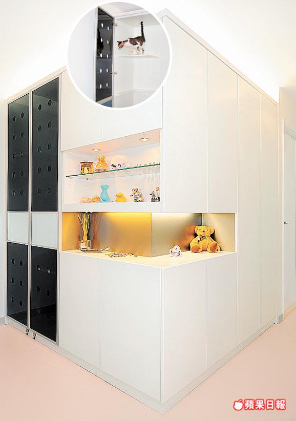 Ernest補充:「戶主有養貓,想有個特定地方畀貓住,於是將大櫃分兩部份,薄身一邊作飾櫃,厚身一邊作貓仔安樂窩,只要打開飾櫃底部櫃門,旁邊有個暗格,貓仔會自行出入。」如此設計周到,女戶主與貓兒都住得舒適。