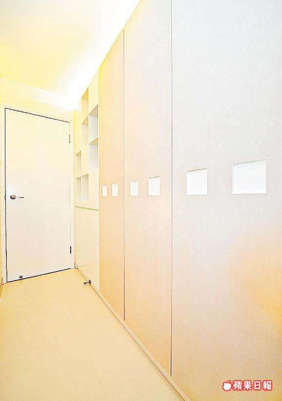 接着移入客廳旁睡房間隔牆,擴闊走廊通道,供飯廳建曲尺形大櫃,修飾突兀的柱躉。