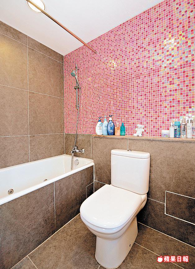 浴室牆身鋪灰色瓷磚,混入一款戶主於裝修期間無意中發現的桃紅色馬賽克紙皮石,大玩深色與鮮色對比,型格觀感強烈。