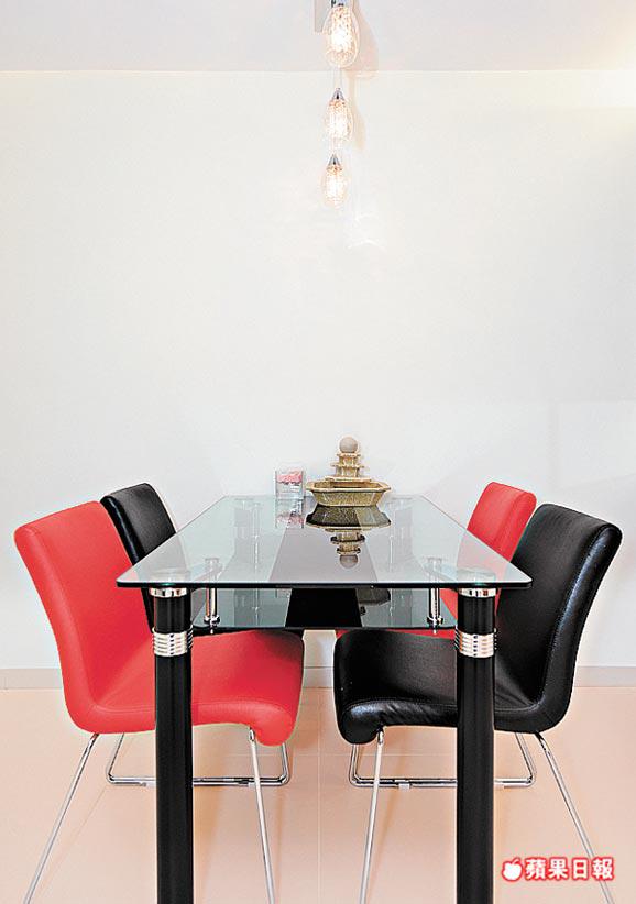 看看飯廳那邊,純白之中點綴黑及紅色椅子,同樣撞色有變化,富美感,散發年輕人朝氣。大廳藍、紅、黑與白色對碰,卻又點到即止,合乎女戶主所要求的設計本意。