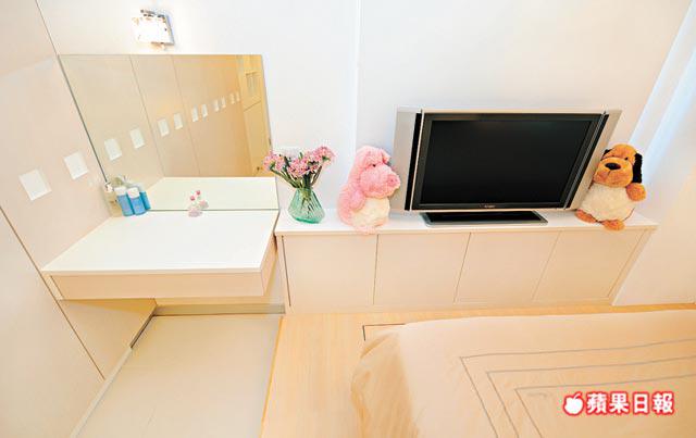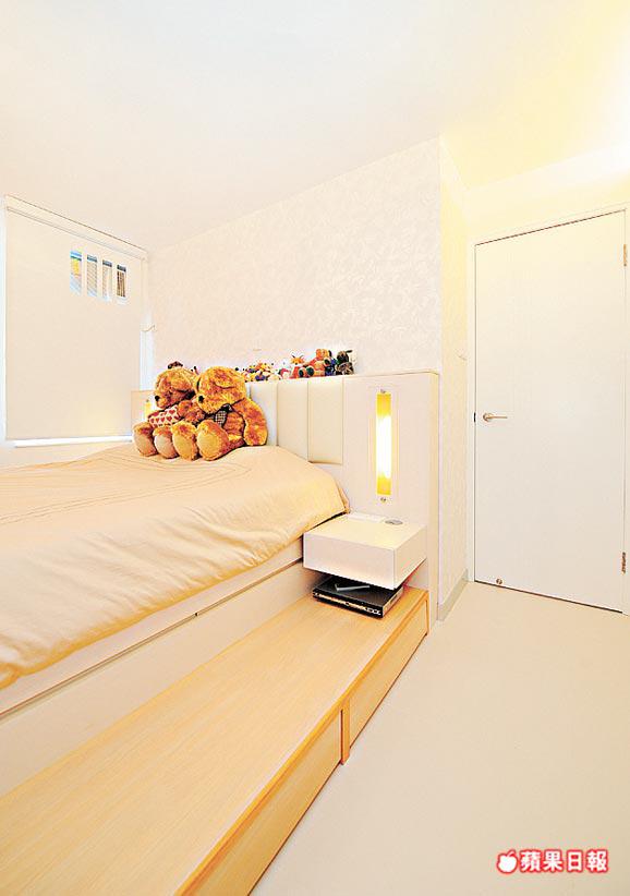 睡房跟大廳一樣用白色為主,建橡木索色地台做床,色調清淡和暖,感覺舒服,地台底部可貯物,亦能滿足女戶主貯物量多的要求。