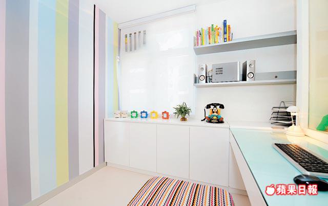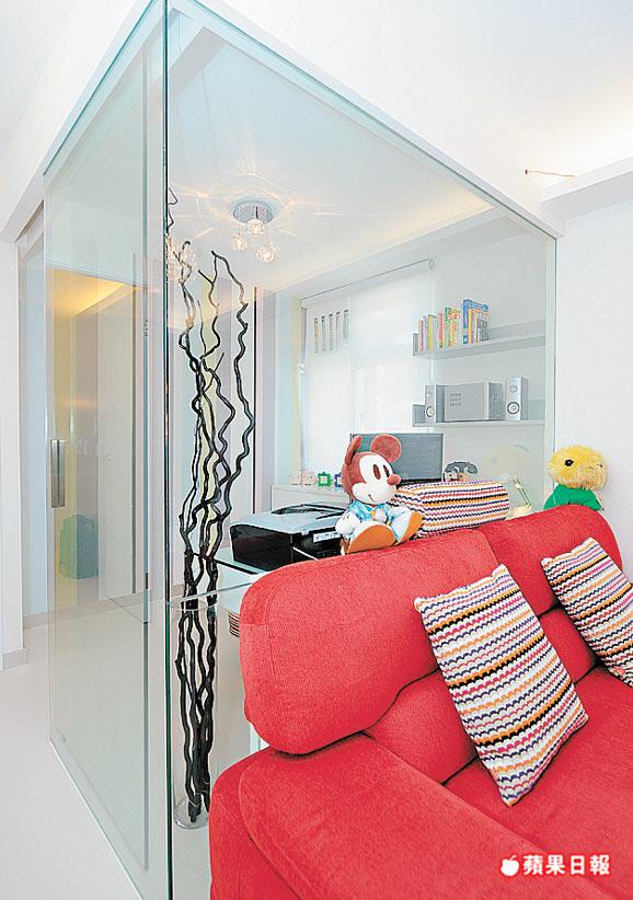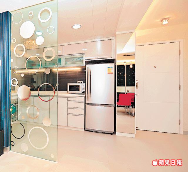 工作室內鋪湖水藍、粉紅及蘋果綠色相間牆紙,屬設計師自家創作,款式獨一無二。Ernest說:「牆紙色彩係戶主按風水批示而指定使用,市面上未必搵到啱用款式,不如自己設計,保證顏色款式一定啱心水。質料方面係膠面纖維底,容易清潔打理。」這類來款訂做牆紙,一般造價為每方呎20餘元。單位選用的玻璃物料,最大幅是客廳與廚房玻璃屏,由強化玻璃造,表面貼上波波圖案紙,可隨喜好換款,有靈活性。廚櫃門由水晶玻璃(右圖)焗漆製,質料與普遍玻璃不同,邊位不帶綠色,反光度高,經焗漆後,更潔白亮麗,也不會如膠板般色調沉實呆板。