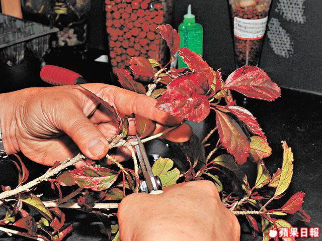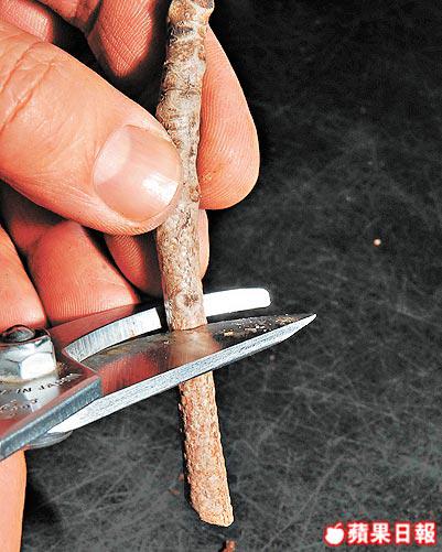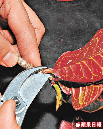 2)剪去所有葉片,並在枝條的頂端以打斜剪斷,讓枝條長出葉來以作光合作用。