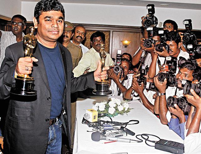 《一百萬零一夜》音樂人幕後功臣,分別贏得最佳原創歌曲和最佳配樂兩獎的「印度張學友」A.R.Rahman(左)昨日在孟買召開記者會,他說希望今次得獎能為事業展開新一頁,並將印度音樂介紹給全世界。另外A.R.Rahman又透露收到了美國過氣樂壇天王米高積遜(MichaelJackson)的祝賀,米高十分認同他以音樂宣揚愛的精神。