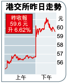 港交所中午公佈業績後,股價下午高開,曾見61.2元,收報59.6元,飆6.62%。