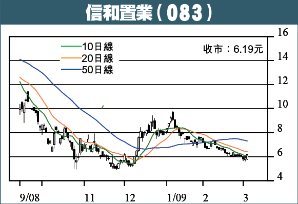 信和置業(083)昨收6.19元,升4.9%。股價重越位處6.07元的10日線,成交大幅增加,料可開展一次較有力的反彈,上破6.40元後,可推向6.90至7.30元阻力區。各主要地產股亦見蠢動,若一同炒上,信置可以較快步伐上升。